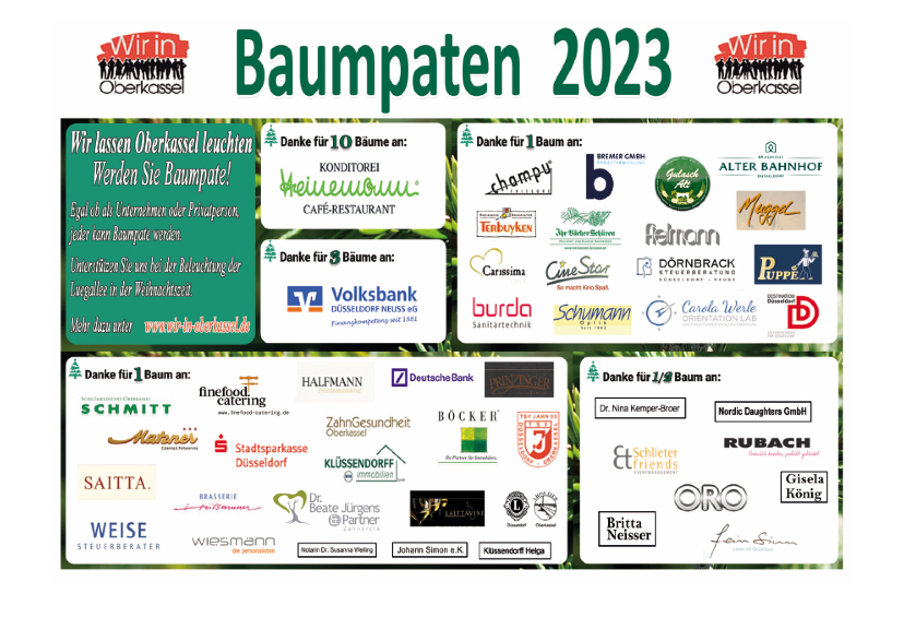 Luegallee im Lichterglanz – Dank an unsere Baumpaten Baumbeleuchtung der Luegallee Wie in jedem Jahr lassen die Baumpaten von WIR in Oberkassel die Luegallee erstrahlen. Mit unserem „Baumpatenabend“ am Dienstag, den 19.12.2023 ab 19 Uhr sagen wir DANKE und laden herzlich ein. Unsere Baumpaten findet Ihr hier: